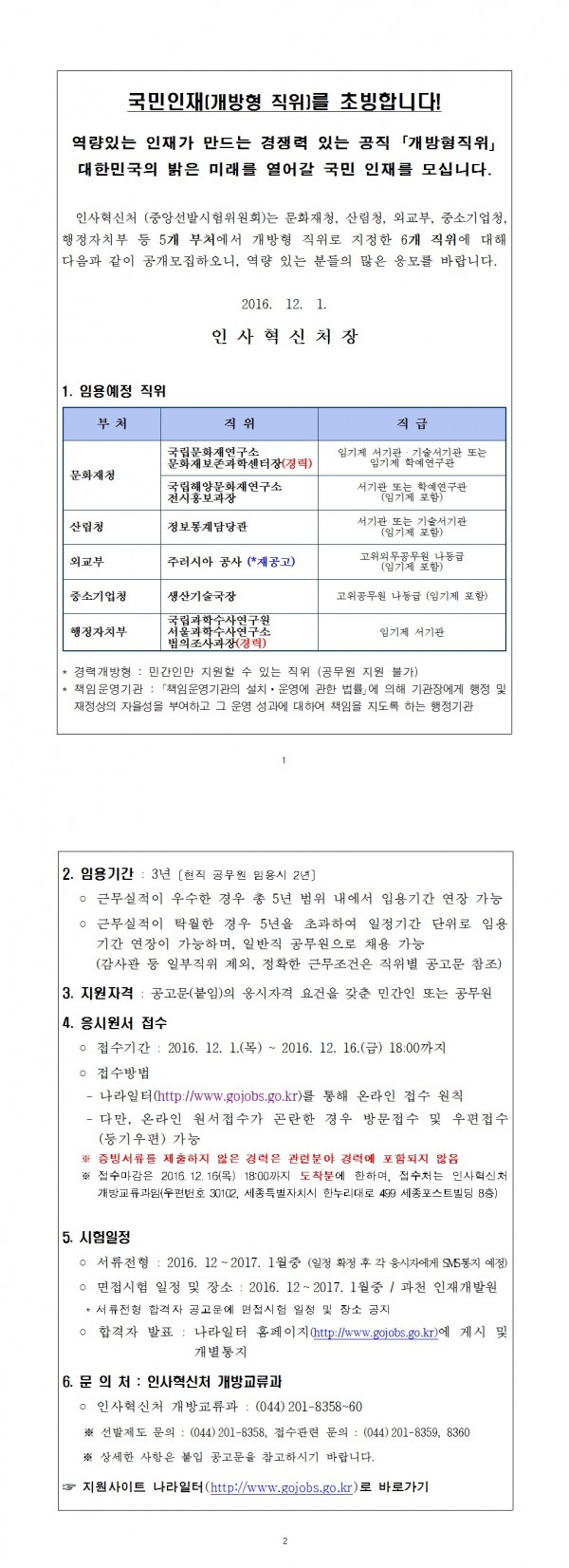 [인사혁신처]2016년 12월 개방형 직위 공개모집 안내