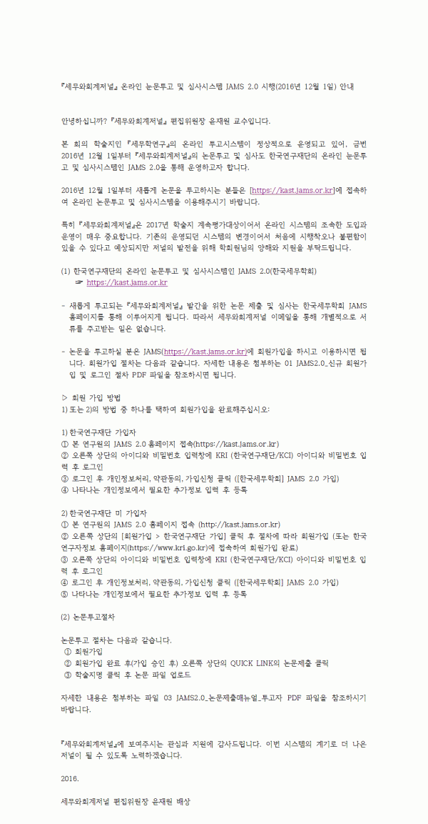 [한국세무학회]『세무와회계저널』 온라인 눈문투고 및 심사시스템 JAMS 2.0 시행(2016년 12월 1일) 안내 한국세무학회 0 6,770 2016.11.21 15:17 목록 본문