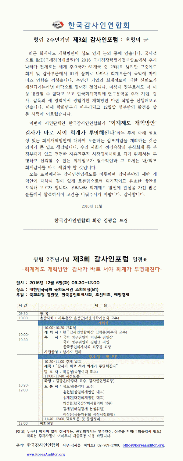[한국감사인연합회]창립 2주년기념 제3회 감사인포럼 일정
