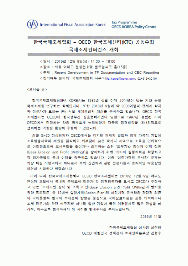 [한국국제조세협회/OECD한국조세센터] 국제조세컨퍼런스 개최안내