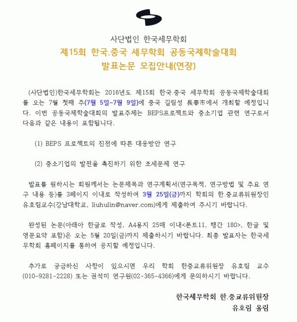 [한국세무학회]제15회 한국.중국 세무학회 공동국제학술대회 발표논문 모집 연장안내(~3/25까지)