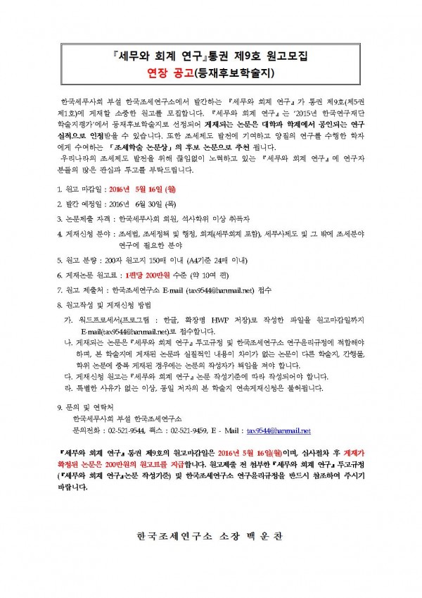 [한국세무사회 부설 한국조세연구소]『세무와 회계 연구』통권 제9호 원고모집 연장 공고(등재후보학술지)