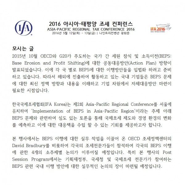 [한국국제조세협회]2016 아시아-태평양 조세 컨퍼런스(5/12~5/13) 한국세무학회 0 7,614 2016.05.11 12:03 목록 본문 *컨퍼런스 개요 및 프로그램은 첨부파일을 참고하여 주시기 바랍니다.
