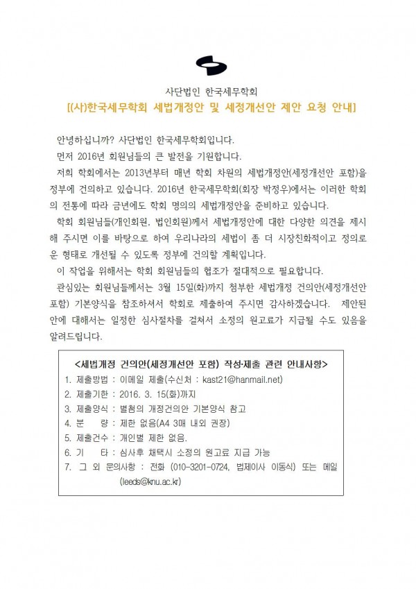 [한국세무학회]세법개정안 및 세정개선안 제안 요청 안내(~3월 15일까지)