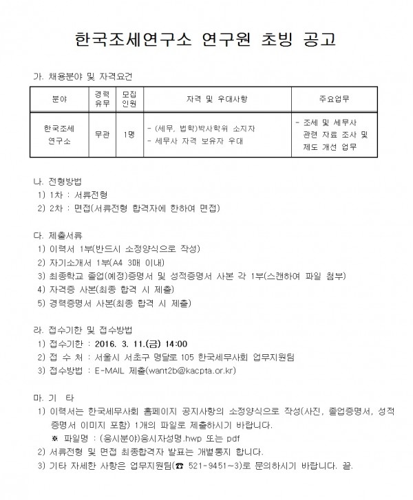 [한국조세연구소] 연구원 초빙 공고