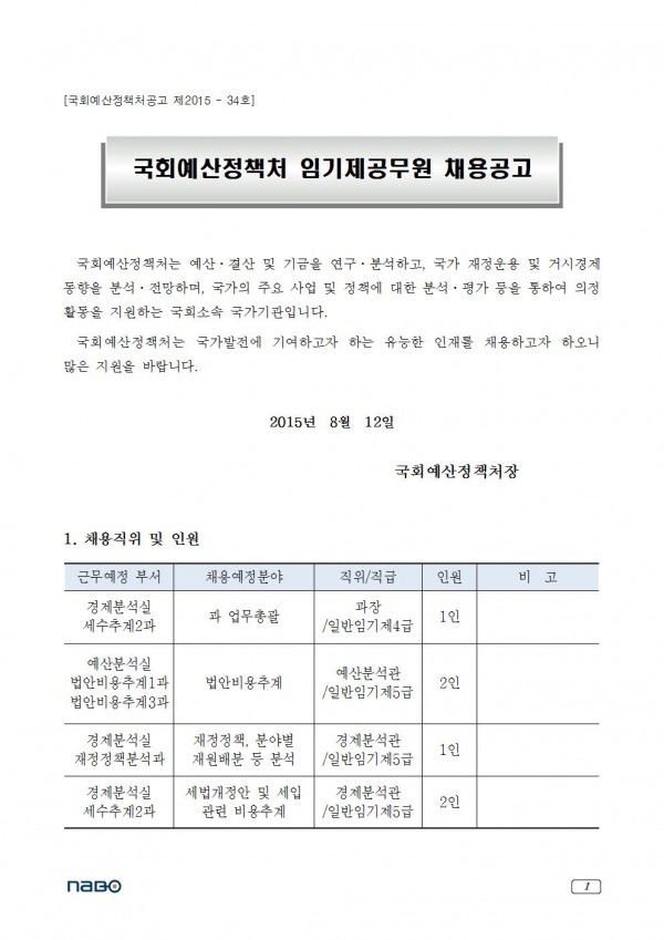 [국회예산정책처]임기제공무원 채용공고