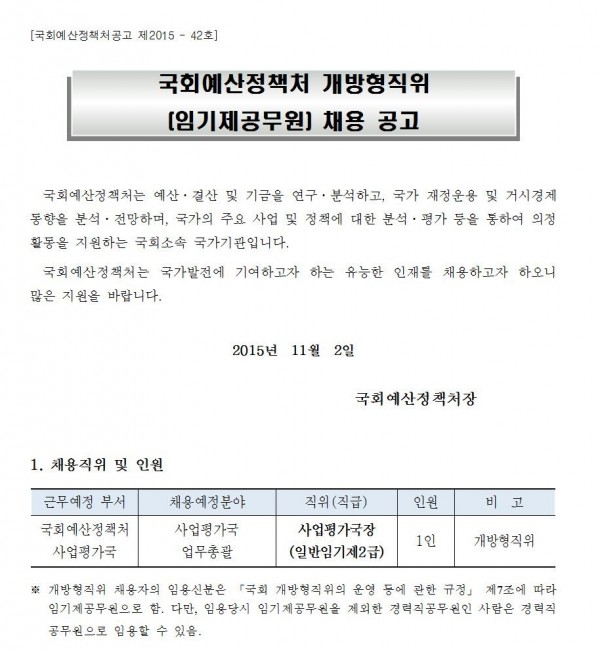[국회예산정책처]개방형직위 (임기제공무원) 채용 공고 한국세무학회 0 9,009 2015.11.03 16:33 목록 본문 * 응시자격 및 자세한 사항은 첨부파일을 참고하여 주시기 바랍니다.