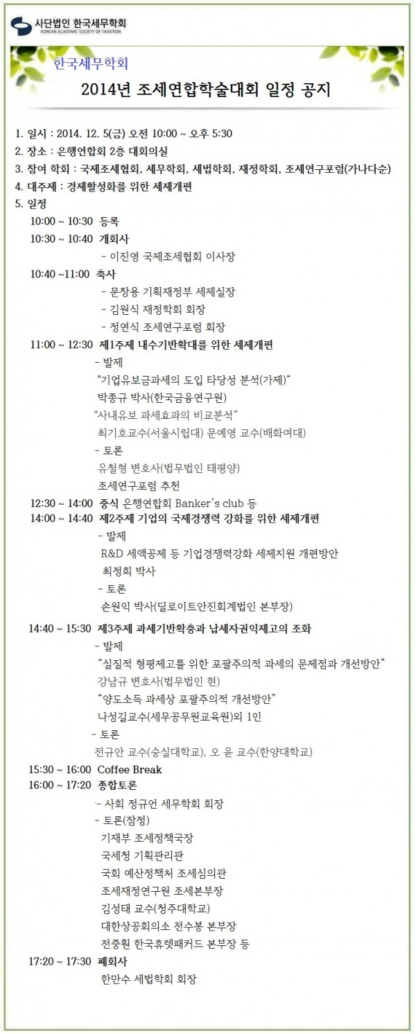 [한국세무학회]2014년 조세관련학회 연합학술대회 일정안내(12/5,금-은행연합회)