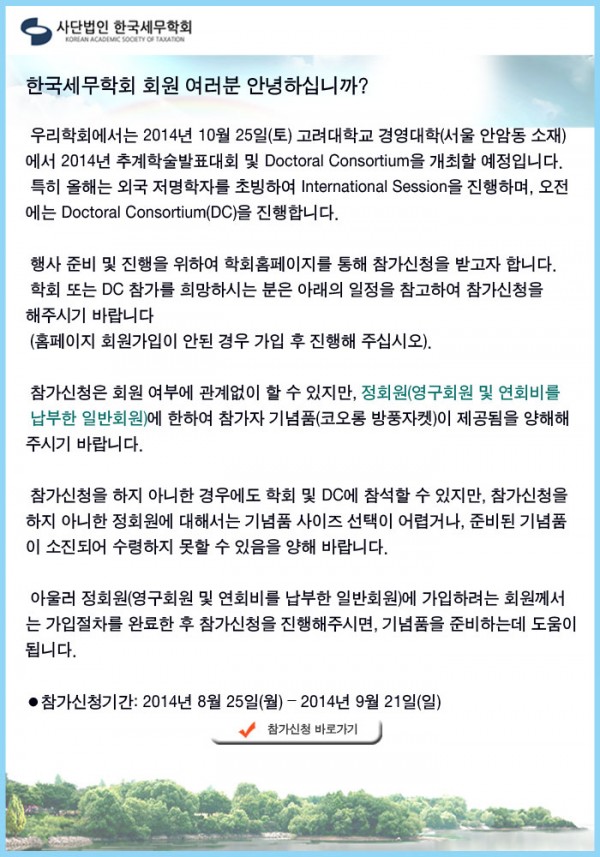 [한국세무학회]2014년 추계학술발표대회 및 Doctoral Consortium 신청 접수공지