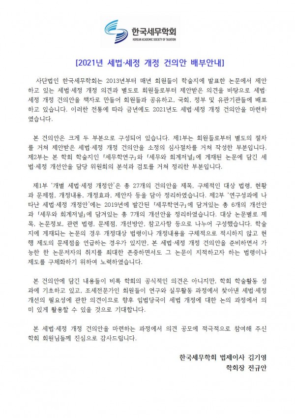 [한국세무학회]2021년 세법/세정 개정 건의안 배부안내