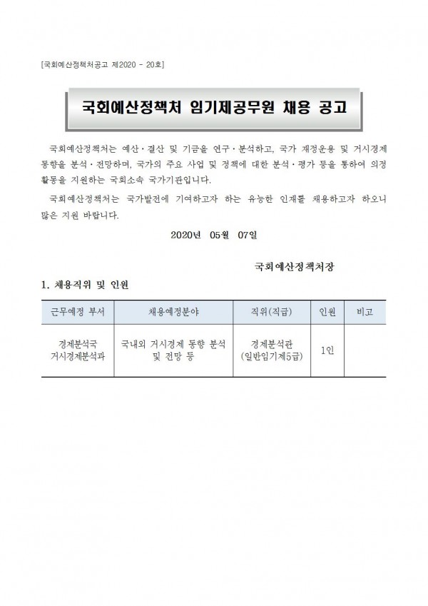 [국회예산정책처] 임기제공무원 채용 공고(거시경제분석과)