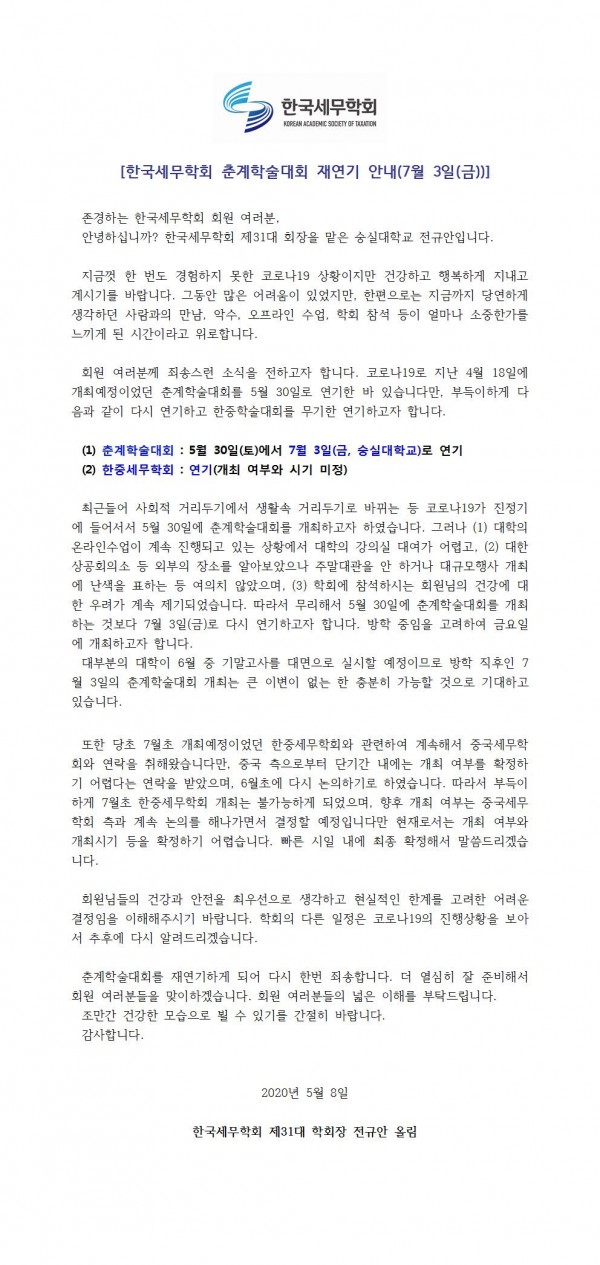 [한국세무학회] 춘계학술대회 재연기 안내(7월 3일(금))
