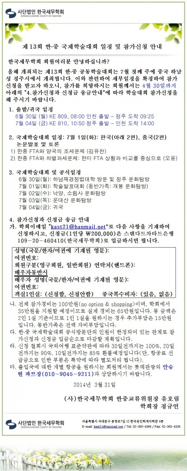 [한국세무학회]제13회 한·중 국제학술대회 일정 및 참가신청 안내