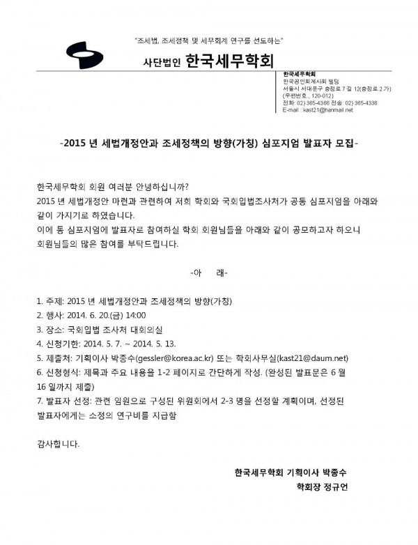 [한국세무학회]2015년 세법개정안과 조세정책의 방향(가칭) 심포지엄 발표자 모집