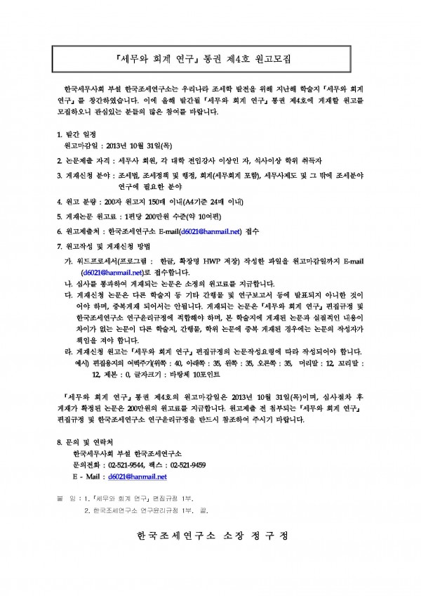 [한국조세연구소]『세무와 회계 연구』통권 제4호(제2권 제2호) 원고모집(편집규정, 윤리규정 파일 포함) 기간연장 10월31일… 한국세무학회 0 12,241 2013.10.01 11:20 목록 본문