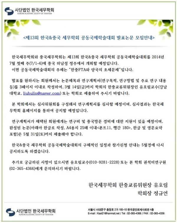 [한국세무학회]제13회 한국&중국 세무학회 공동국제학술대회 발표논문 모집안내