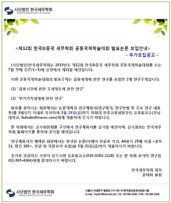 [한국세무학회]제12회 한국&중국 세무학회 공동국제학술대회 발표논문 모집안내(추가모집공고,~3월29일까지)