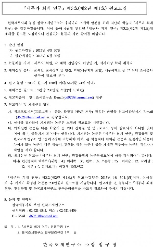 [한국조세연구소]『세무와 회계 연구』제3호(제2권 제1호) 원고모집(편집규정, 윤리규정 파일 포함) (2013.4.30.까지) 한국세무학회 0 12,033 2013.04.11 10:21 목록 본문