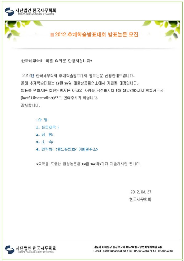 2012 추계학술발표대회 발표논문 모집 : 제목접수 9/20(목)