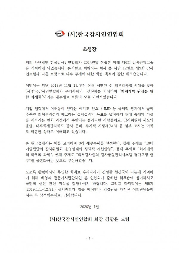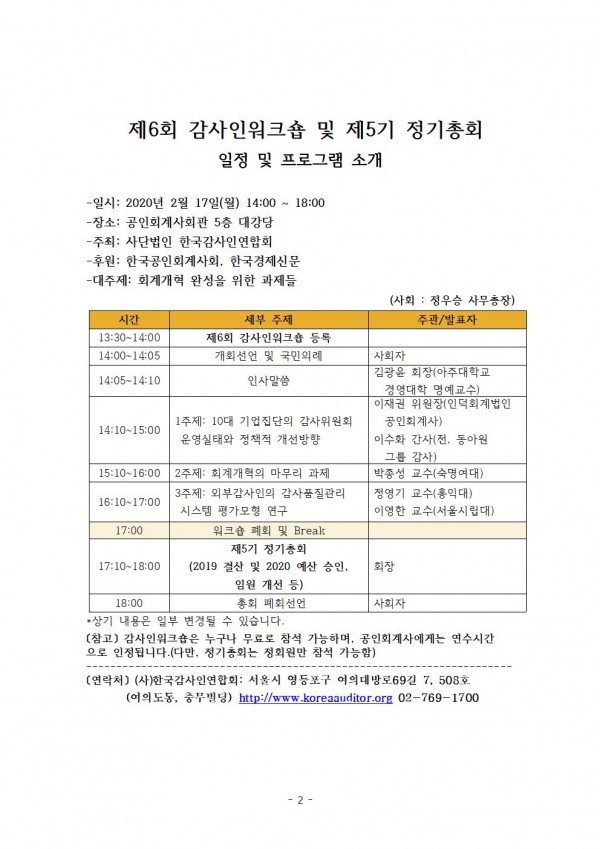 (사)한국감사인연합회가 오는 2/17(월) 오후에 한공회관에서 개최할 예정이었던 제6회 감사인워크숍 및 6기