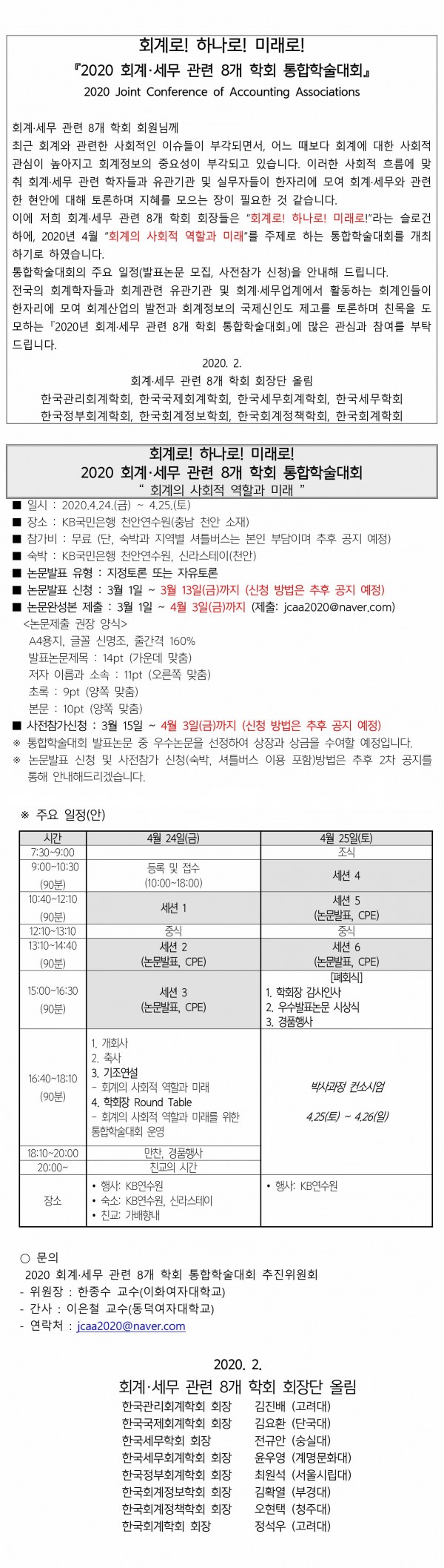 2020 회계.세무관련 8개 학회 통합학술대회 일정 안내 (4/24(금)-25(토), KB국민은행 천안연수원)