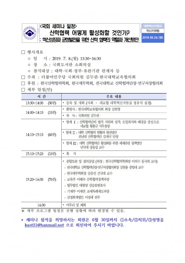 [한국대학교육협의회]산학협력 어떻게 활성화할 것인가? : 혁신성장과 균형발전을 위한 산학 협력의 역할과 개선방안 세미나 안내 한국세무학회 0 4,940 2019.06.26 14:30 목록 본문 * 세미나 참석을 희망하시는 회원은 6월 30일까지 ①소속/②직위/③성명을 kast21@hanmail.net 으로 회신하여 주시기 바랍니다.