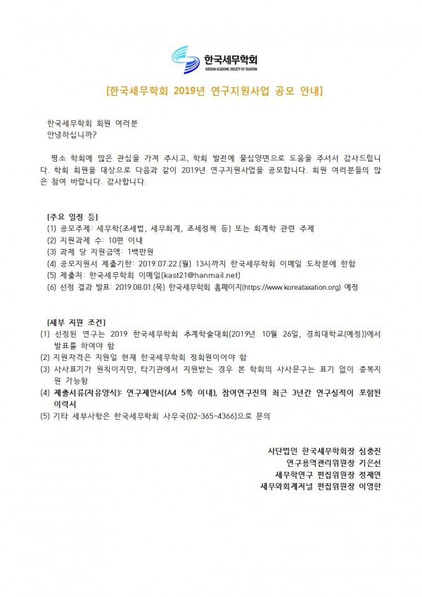 [한국세무학회] 2019년 연구지원사업 공모 안내