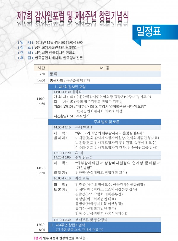 [(사)한국감사인연합회] 제7회 감사인포럼 및 제4주년 창립기념식 초청