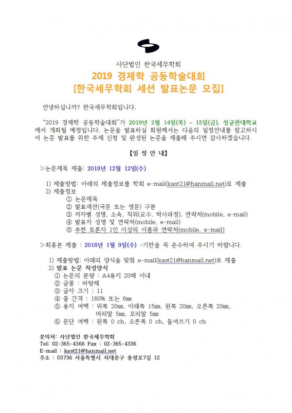 [한국세무학회]2019 경제학 공동학술대회 한국세무학회 세션 발표논문 모집