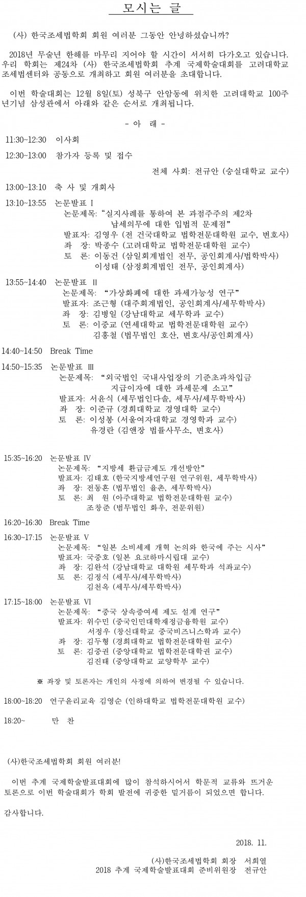 [(사)한국조세법학회]2018 (사)한국조세법학회 추계 국제학술대회 초청의 글