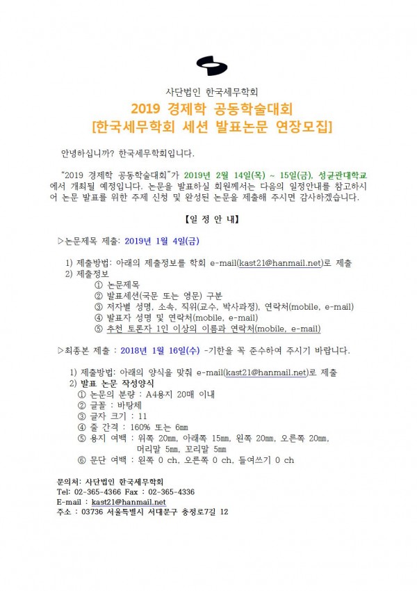 [한국세무학회]2019 경제학 공동학술대회 한국세무학회 세션 발표논문 연장모집(2019/1/4까지)