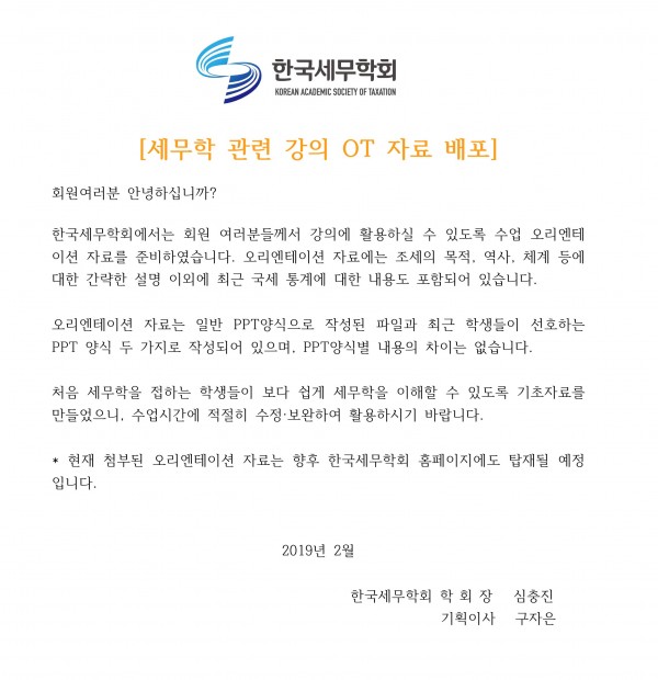 [한국세무학회] 세무학 관련 강의 OT 자료 배포