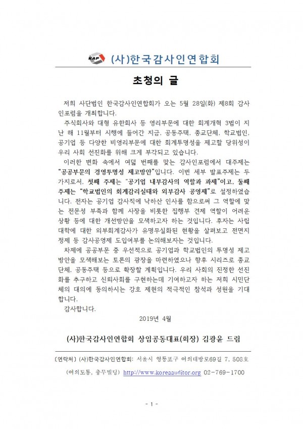 [(사)한국감사인연합회]제8회 감사인포럼 "공공부문의 경영투명성 제고방안" 개최안내