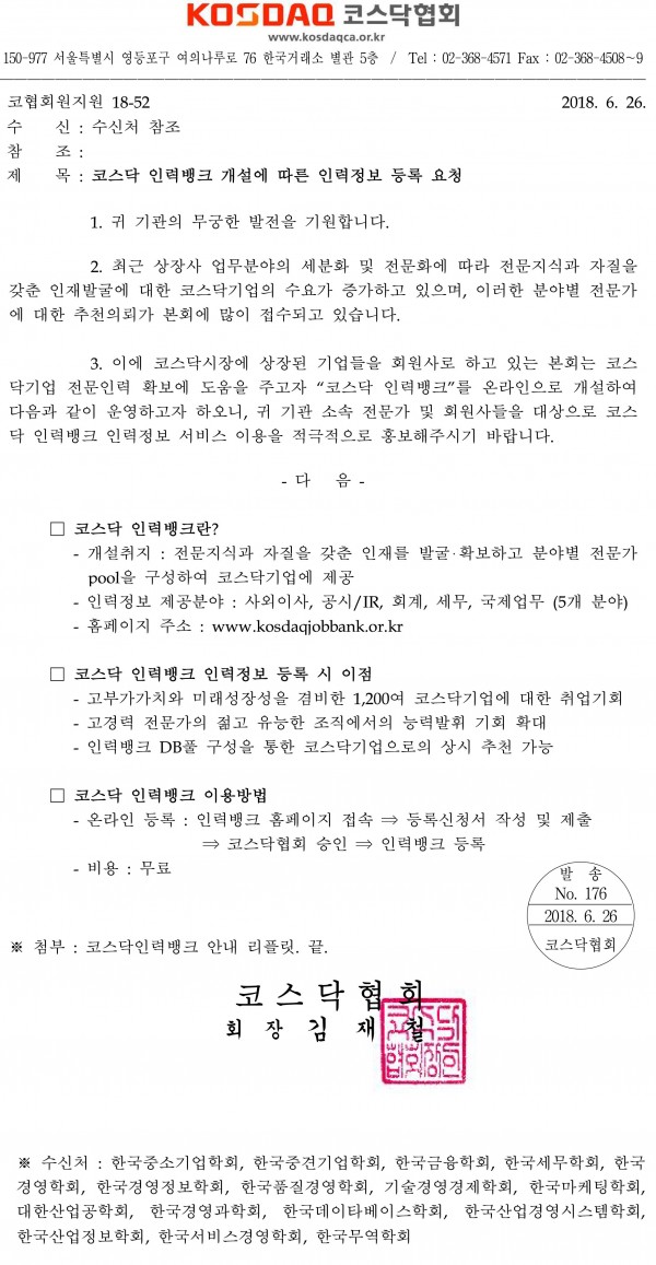 [코스닥협회]코스닥인력뱅크 개설에 따른 인력정보 등록 요청
