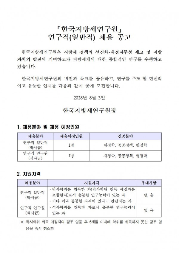 [한국지방세연구원] 연구직(일반직) 채용 공고