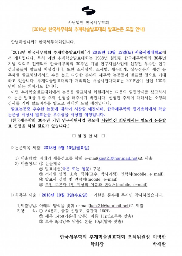 [한국세무학회] 2018년 추계학술발표대회 발표논문 모집 안내(9/10까지)