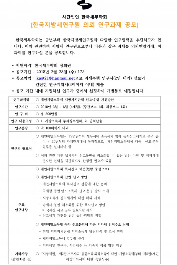 [한국세무학회]한국지방세연구원 의뢰 연구과제 공모
