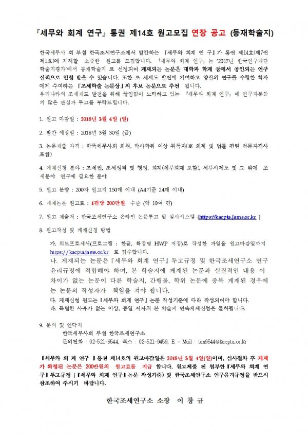 [한국조세연구소] 『세무와 회계 연구』 통권 제14호 원고모집 연장 공고(등재학술지) 한국세무학회 0 7,883 2018.02.26 16:54 목록 본문 한국세무사회 부설 조세연구소학술지(세무와 회계 연구) 담당02-521-9544