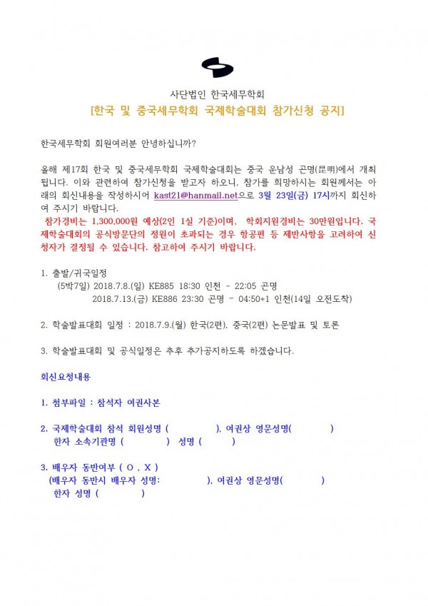 한국 및 중국세무학회 국제학술대회 참가신청 공지