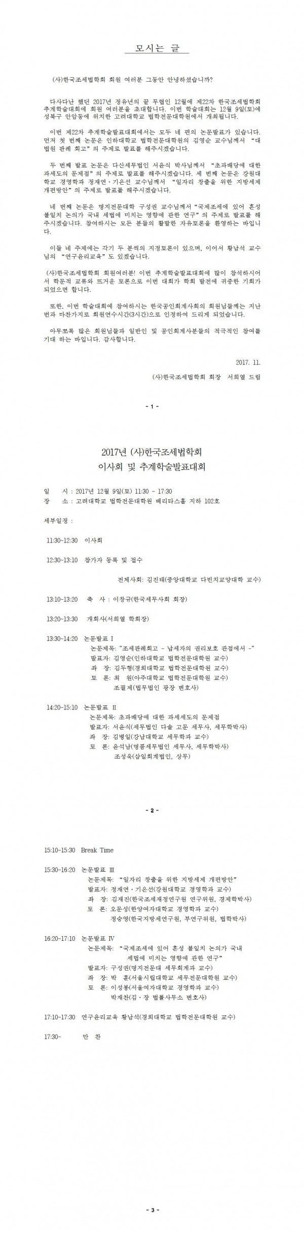 [(사)한국조세법학회] 2017년 (사)한국조세법학회 이사회 및 추계학술발표대회 개최