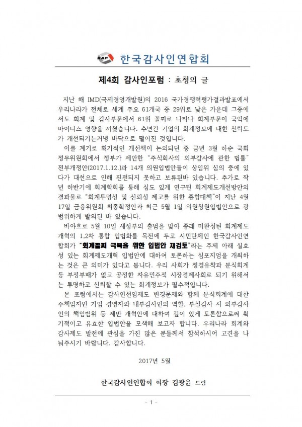 [한국감사인연합회]제4회 감사인포럼 초청의 글