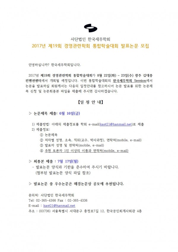 [한국세무학회]2017년 제19회 경영관련학회 통합학술대회 발표논문 모집