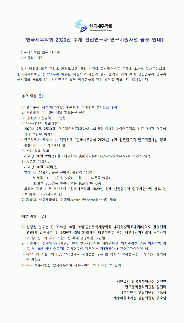 [한국세무학회]2020년 추계 신진연구자 연구지원사업 공모 안내