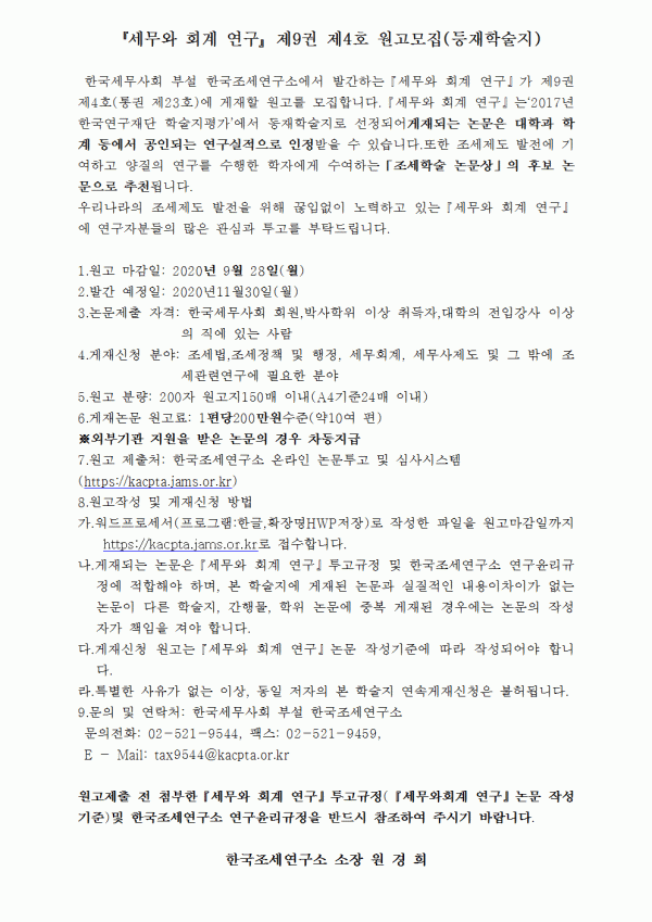 [한국조세연구소]『세무와 회계 연구』 제9권 제4호 원고모집(등재학술지)