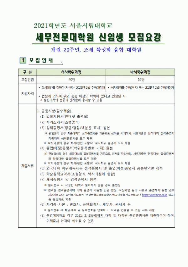 [서울시립대] 세무전문대학원 입학안내(2020. 11. 2(월) 10:00~11. 6(금) 17:00까지 접수)