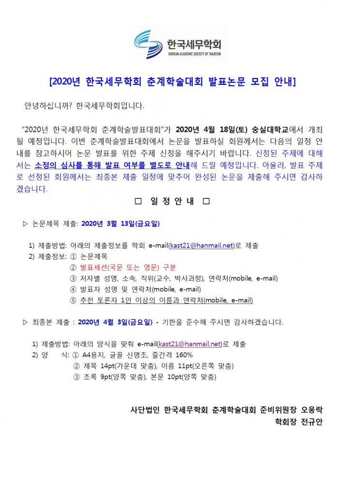 [한국세무학회]2020년 한국세무학회 춘계학술대회 발표논문 모집 안내(~3월 13일까지)