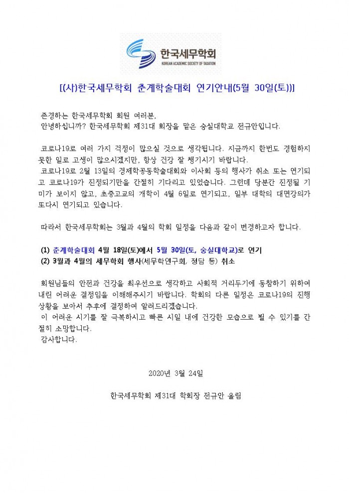 [한국세무학회]한국세무학회 춘계학술대회 연기안내(5월 30일(토))