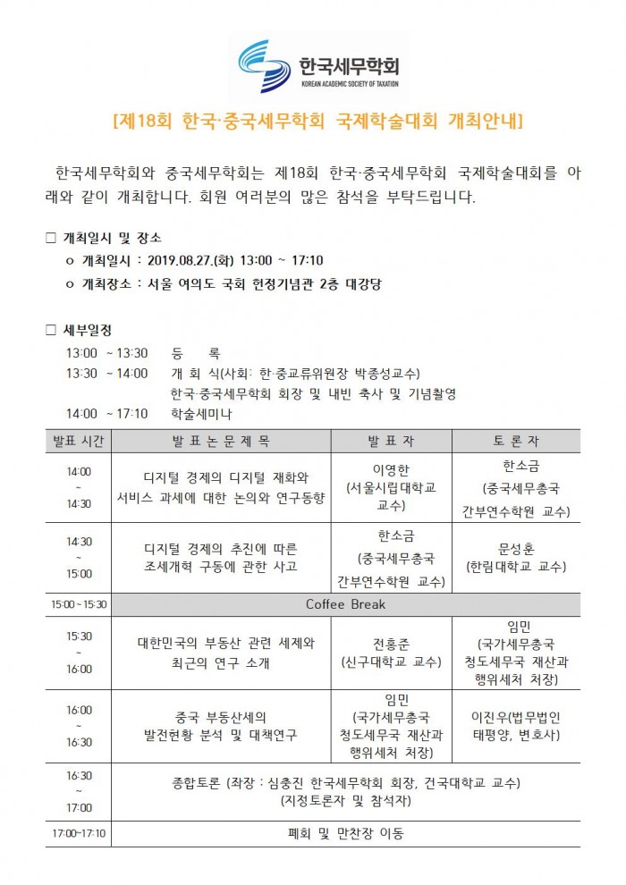 제18회 한국·중국세무학회 국제학술대회 개최안내