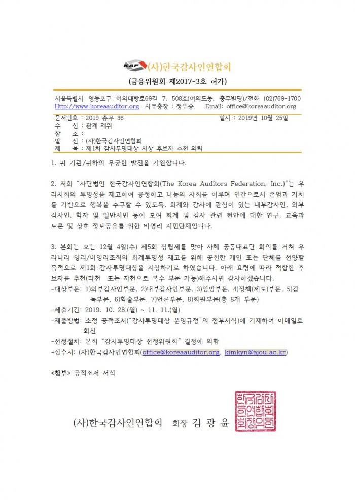 [공지][(사)한국감사인연합회]] 제1회 감사투명대상 수상후보 추천의뢰 공지 한국세무학회 0 10,319 2019.10.25 15:53 첨부파일 - 첨부파일: 공적조서-서식.hwp (14.5K) 0 2019-10-25 15:53:43 목록 본문