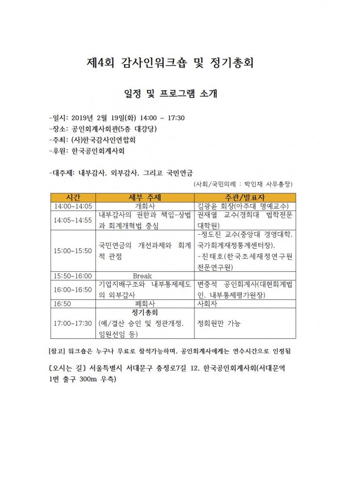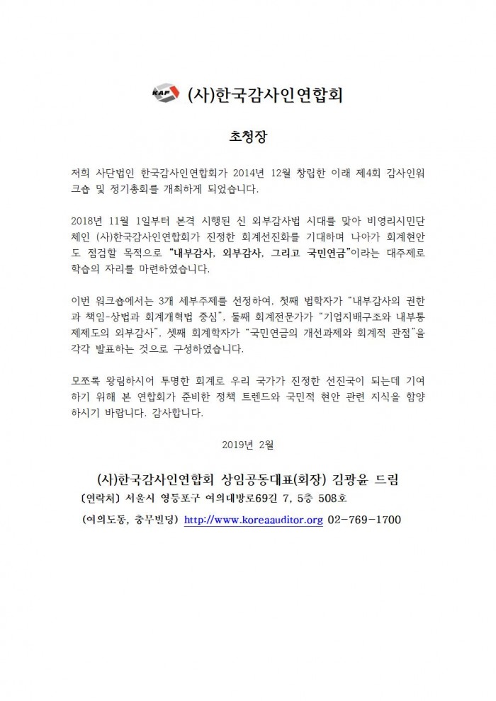 [(사)한국감사인연합회] 제4회 감사인워크숍 및 정기총회 초청